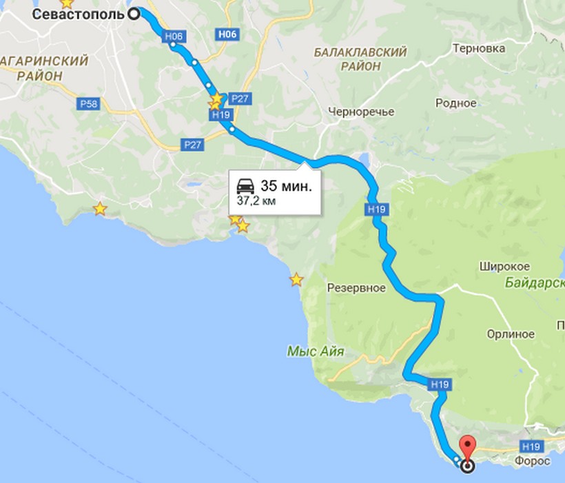 Мыс Сарыч находится на расстоянии 30 километров от Севастополя и 40 от Ялты.