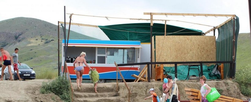 Единственное место, где можно поблизости приобрести напитки и еду, это небольшая палатка возле входа на базу отдыха.