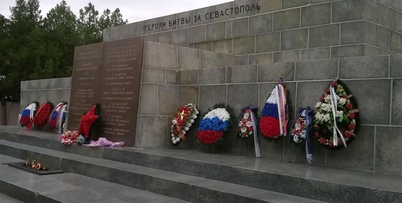 С левой стороны от памятника Славы установлена мемориальная стена, на которой высечены названия всех частей и полков советских войск, получивших награды за освобождение Севастополя в 1944 году.