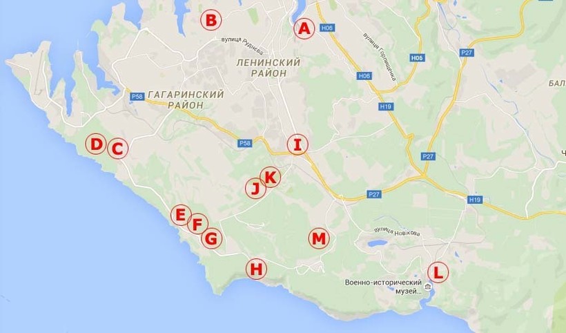 - H — Монастырь, Яшмовый пляж, Скала явления Святого Георгия. Чтобы спуститься, надо пройти более 800 ступенек, обратно можно не подниматься, так как с пляжа ходит городской катер в Балаклаву. 200 рублей для взрослых, для детей до 7 лет — бесплатно. Так же ходят частные катера и лодки, цена от 200 рублей (зависит от типа лодки).