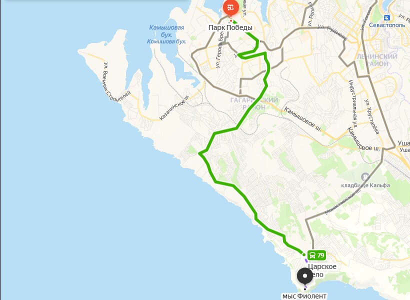 Из центральной части города еще удобно можно добраться от парка Победы до мыса Фиолент. По маршруту курсирует прямой автобус № 79 с 06:30 до 17:30 с интервалом в 1,5–2 часа.