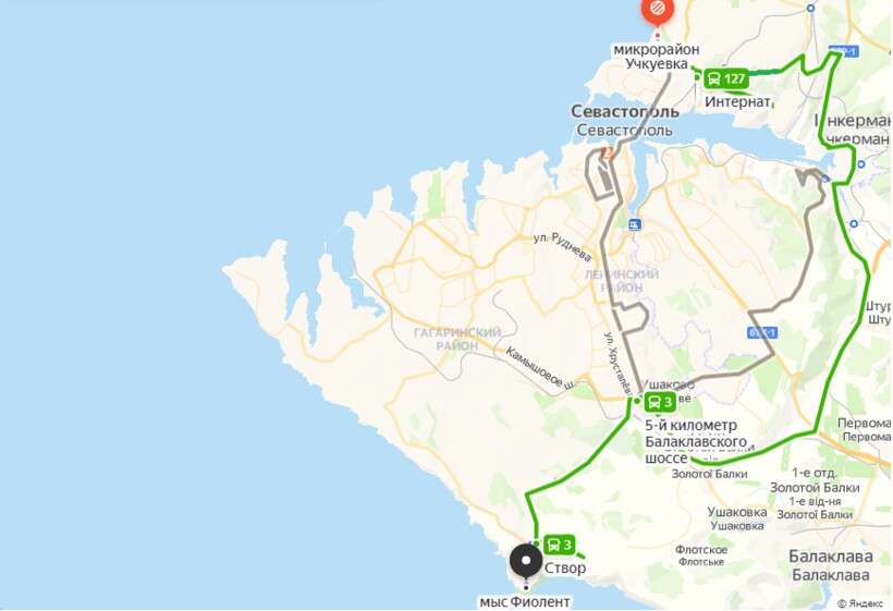 Но не только из центральной части города туристы едут на дикие пляжи мыса. Например, актуален и вопрос, как добраться до мыса Фиолент из Учкуевки (северной части Севастополя). Оптимальный вариант с одной пересадкой следующий: на остановке «Интернат» садитесь на автобус № 127, который следует прямо до 5-го км Балаклавского шоссе. Доедьте до конечной остановки и пересядьте на автобус № 3, 24, 35 или 79 (в сторону мыса и Севастополя).
