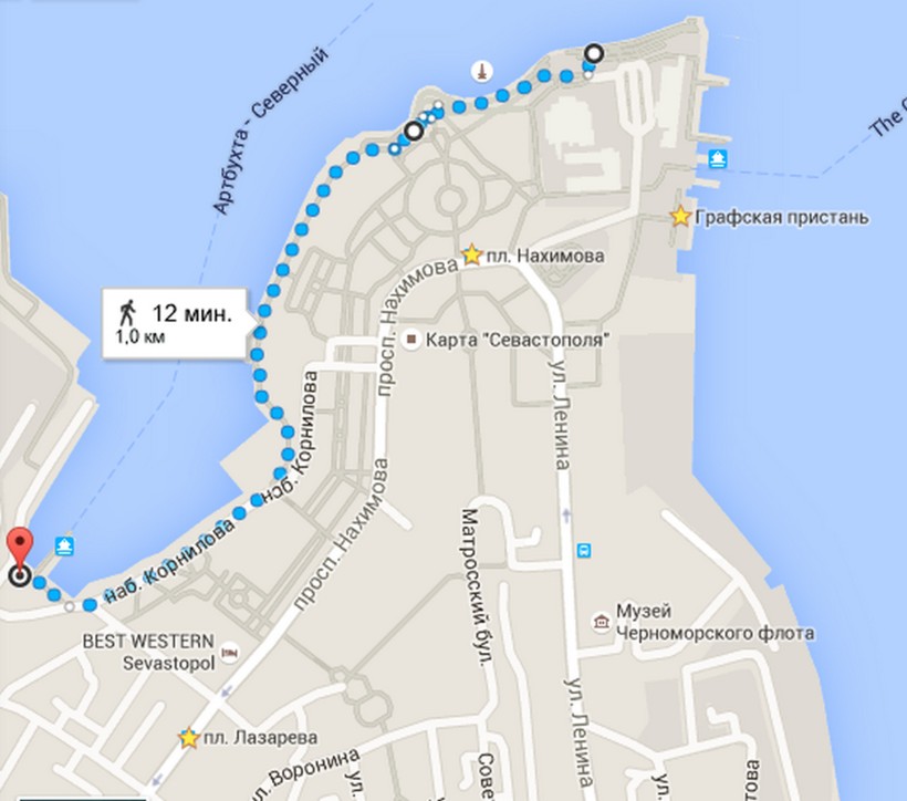 Далее набережная плавно огибает Артбухту. В этом месте находится пристань, откуда отправляются паромы и катера на Северную сторону и Радиогорку. Чуть в сторонке можно заметить монумент, который сообщает о том, что набережная получила свое название в честь адмирала Корнилова.