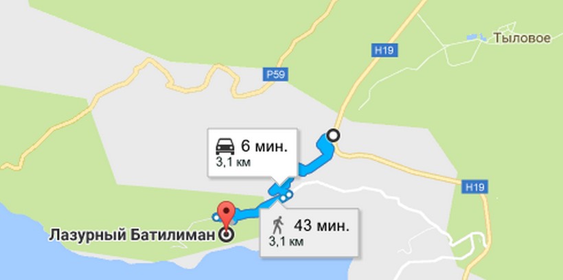 Далее необходимо выехать на трассу Н-19 и следовать, никуда не сворачивая, до поворота на бухту Ласпи. Завернув направо, спускаемся вниз по асфальтированной дороге до ворот базы отдыха, которая находится в паре сотен метров от моря. В урочище Батилиман нет автостоянки для туристов, которые отдыхают самостоятельно.