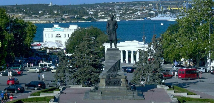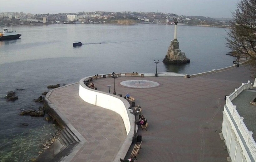 На знаменитой севастопольской набережной установлено несколько видеокамер. Одна из них, для показа крупного плана, установлена на северном конце приморской дорожки, на здании ресторана. Хорошее разрешение видеокамеры позволяет рассмотреть отдыхающих пенсионеров, гуляющих голубей, детей, пробующих ногой морскую воду. Но даже при высокой установке этой веб-камеры Севастополь, набережная Корнилова полностью в кадр не помещается. Зато хорошо видны детали памятника — венки, якоря, барельефы.