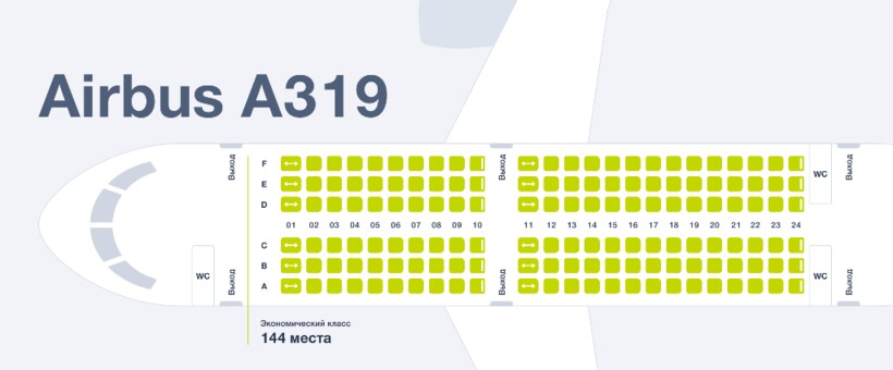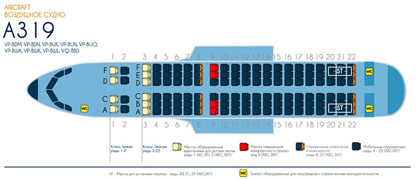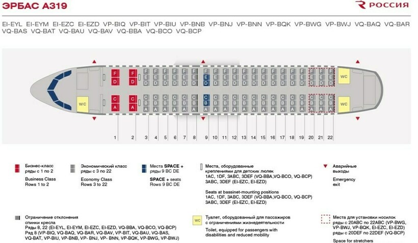 Экономкласс у этой версии лайнера Airbus A319 заканчивается 23 рядом, неудобными считаются и места в 9 ряду. Авиакомпания «Россия» выделяет в отдельную категорию Space+ места 9A, 9B, 9C, 9D, 9E, 9F(в первой компоновке), 10A, 10B, 10C, 10D, 10E, 10F — во втором варианте расположения кресел. По информации с официального сайта авиаперевозчика доплата за места в категории Space+ составляет 1000–3200 ₽ (в зависимости от дальности перелета).