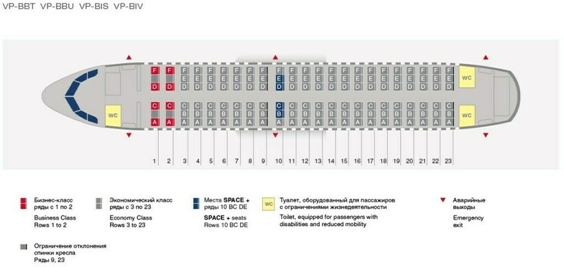 ЭТО ВАЖНО! У четырех самолетов («Анапа», «Псков», «Челябинск», «Омск») авиакомпания «Россия» проводила модернизацию самостоятельно. Поэтому разные классы не разделены перегородкой. Для 8 мест бизнес-класса использованы обычные кресла экономкласса со свободным пространством между ними. Комфорт этих кресел заметно уступает фирменным сиденьям заводского изготовления.