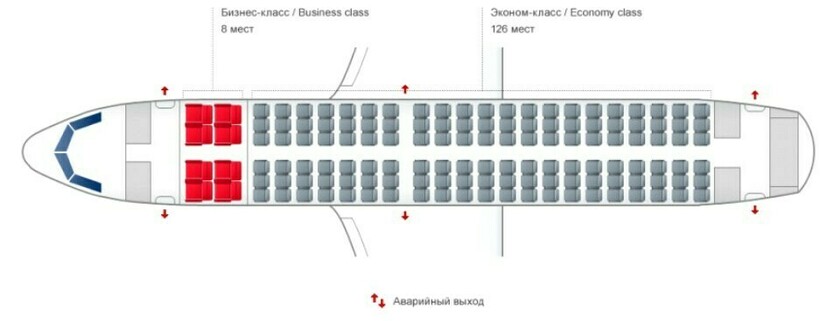 Проход между рядами кресел получился узким, но это типовой недостаток салонов экономкласса. В модификациях с отсеком бизнес-класса вместимость авиалайнера варьируется от 124 до 134 посадочных мест. В первом отсеке, за перегородкой к хозяйственным службам и экипажу, устанавливается 2 или 4 двухкресельных блока. В больших, широких креслах бизнес-класса удобно сидеть или полулежать, возле каждого из них расположено 2 иллюминатора.
