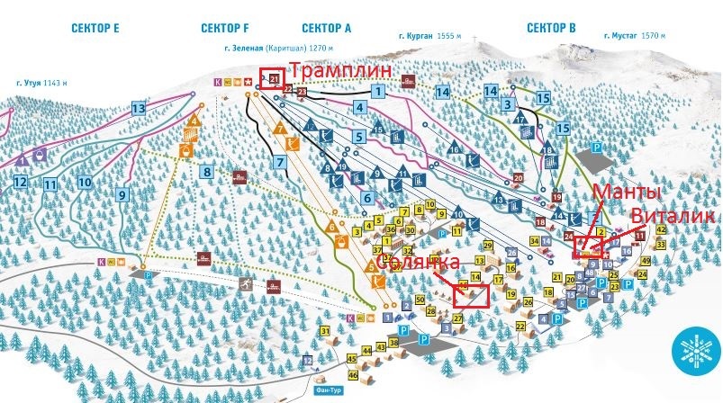 Ниже приведена карта, на которой обозначены канатные дороги и подписаны сектора слева направо.