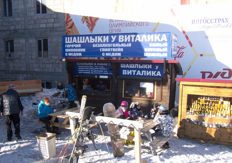 Кроме того, живут в посёлке в основном в квартирах: 1-но, 2-х, 3-х комнатных. Цена зависит от количества комнат, на каждую, в среднем, по два спальных места. Есть и возможность дополнительного размещения – раскладушки и матрасы, но о подобном нужно договариваться с хозяином. В любом случае, это обычно в два раза дешевле, чем гостиницы у подножья. В самом посёлке есть пара отелей, там жить дороже чем в квартире, но, если вам нужны документы о проживании, – вам туда.