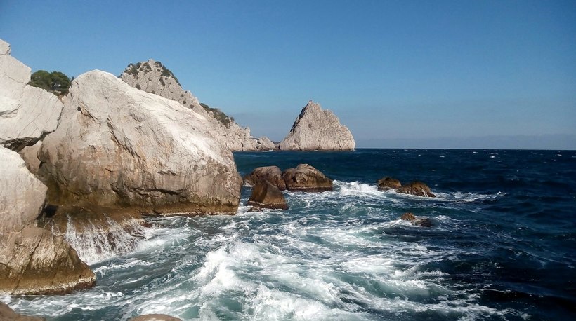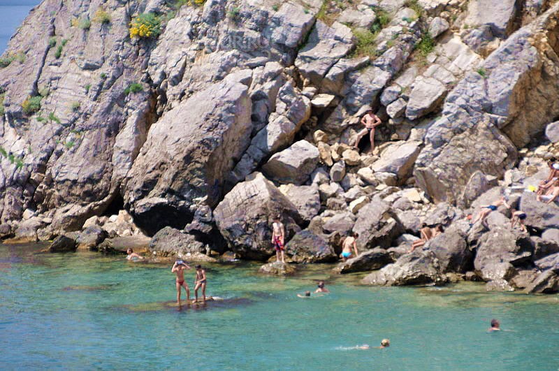 Само собой, без нудистского пляжа в таком месте не обойтись. Он находится внизу, под скалой Крыло Лебедя, где товарищи нудисты ютятся на огромных белых глыбах известняка. Очень красивый дикий пляж: рядом высоченная отвесная скала, а причудливых форм камни разбросаны по берегу моря, в воде много рыбешек, крабов и разноцветных морских растений.