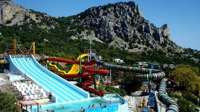 - Аквапарк «Голубой Залив» Симеизский аквапарк под открытым небом является одним из самых популярных на ЮБК. Куча горок различной длины и высоты, бассейнов, баров и кафешек (один бар даже находится прямо посреди бассейна). Фишка аквапарка — это морская вода в бассейнах. Морская вода это, конечно, хорошо, но об антисанитарии не забывай. Поэтому в нее все равно добавляют хлорку. Соленая вода с хлоркой — удовольствие на любителя, но что делать. Тем не менее, авантюристы и почитатели аттракционов не останутся равнодушными, да и для детей этот аквапарк располагает весьма неплохими условиями. Не так уж и плохо провести день с семьей или друзьями, катаясь на веселых горках с прекрасным видом на море и близлежащие скалы.
