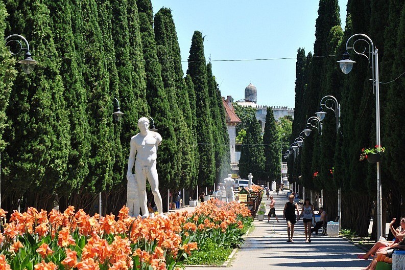 - Кипарисовая аллея (Аллея Аполлонов) Эта аллея — Арбат «местного разлива». Самая популярная прогулочная зона конкурирует даже с набережной. Тенистый сквер со статуями греческих юношей и множеством удобных лавочек любима всеми не зря. Мне самой очень нравится отдыхать там от зноя. С одной ее стороны видно виллу «Ксения», с другой — вершину горы Кошка. В середине размещены игровые зоны для детей, по краям киоски с квасом и сладостями.