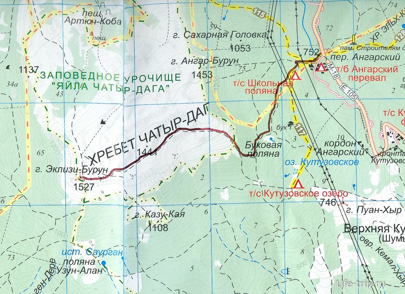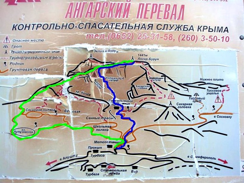 Выходить нужно на остановке «Ангарский Перевал» (от Ялты где-то 1,5 часа в пути). С остановки нужно по лесной дороге на одноименную турбазу. От нее начинается тропа на вершину. Там будет развилка, на которой нужно повернуть налево. Вскоре вы окажитесь на просеке с линией электропередач, за ней опять развилка — поворачиваем направо, топаем дальше и оказываемся на Буковой поляне. От нее уже начинается маркированная тропа с красными отметками на деревьях. Кстати, на поляне есть родник с чистой водой, в котором очень приятно напиться и умыться в жару. Дальше тропа набирает круто вверх и выходит уже на плато. На самом плато есть указатели, показывающие путь к экскурсионным пещерам и турбазам.