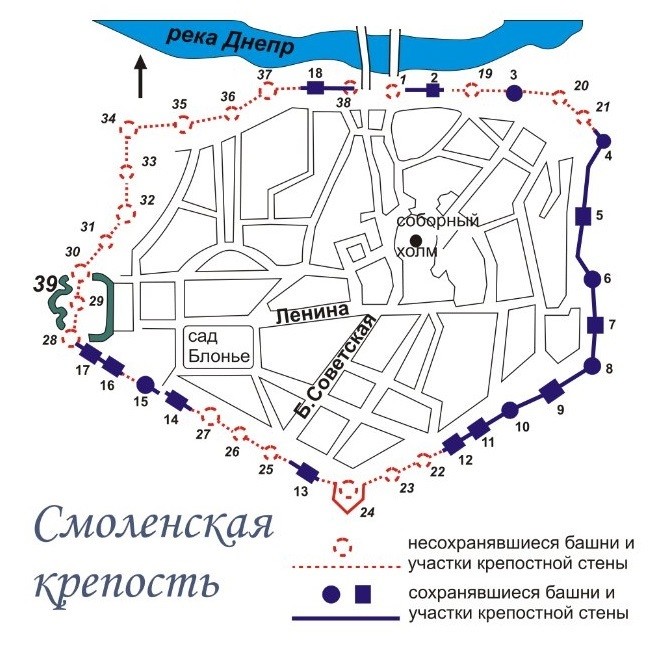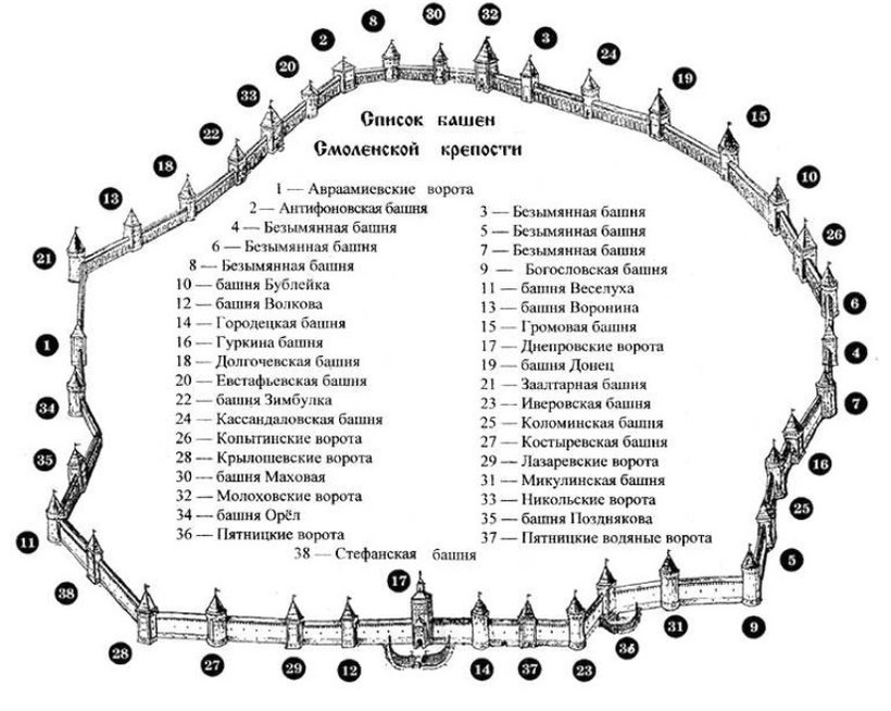 Спустя семь лет стена была закончена, а уже в 1609–1611 годах она успешно перенесла 20-месячную осаду армии польского короля Сигизмунда III. Схема Смоленской крепостной стены представлена ниже.