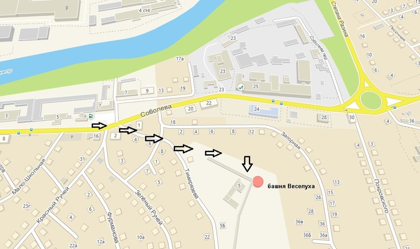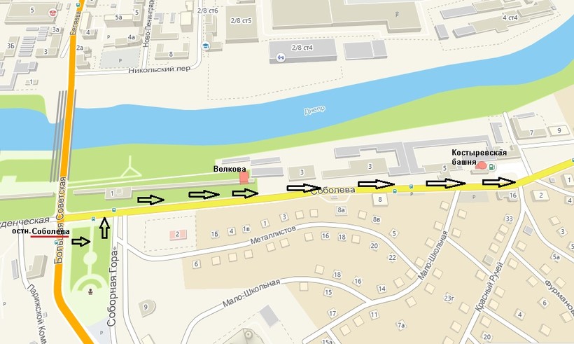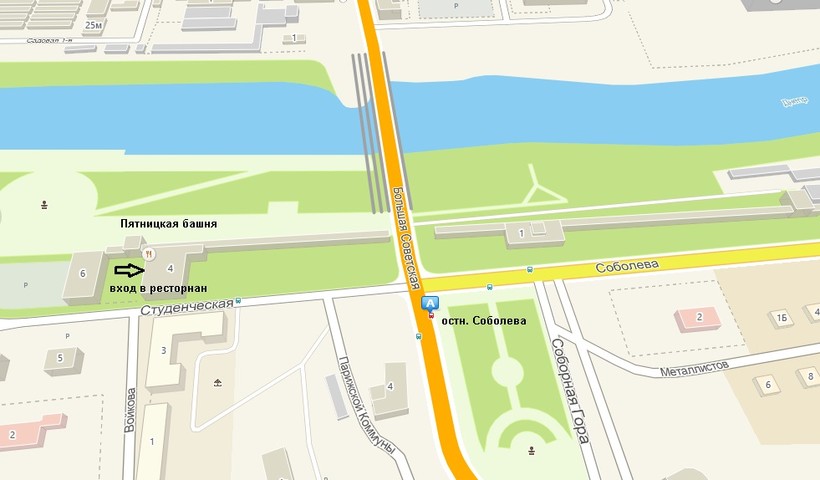 Доезжаем до остановки Соболева и идем в ресторан (показано на карте).