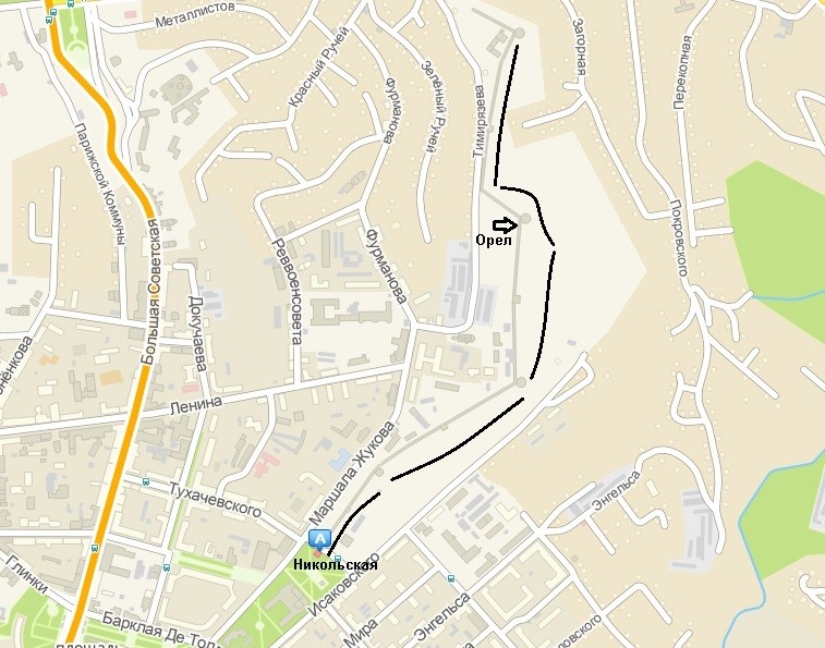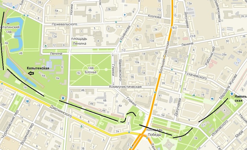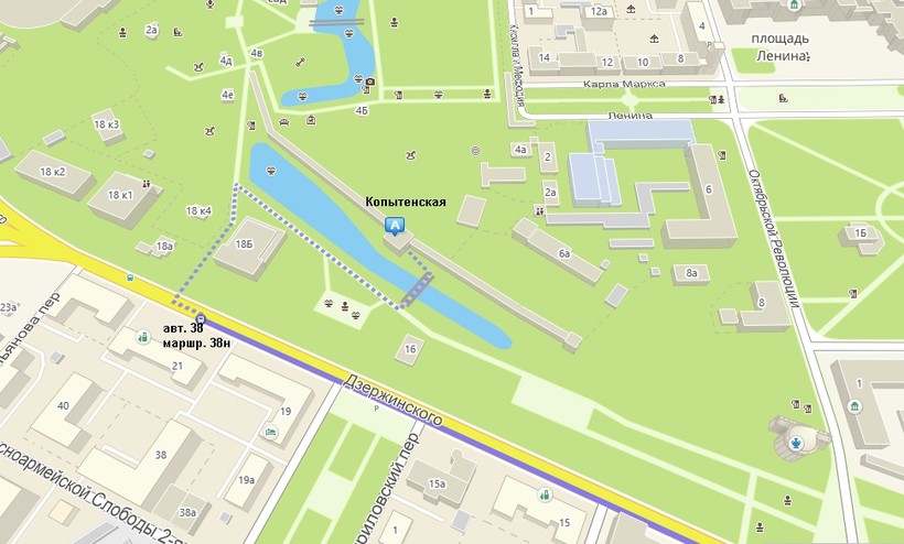 Если вы закончили свой маршрут у Копытенской башни, то добраться до ресторана можно на автобусе №38 или маршрутке №38 н. Просто перейдите дорогу (улица Дзержинского), как показано на карте и дождитесь необходимого транспорта на остановке Дзержинского.