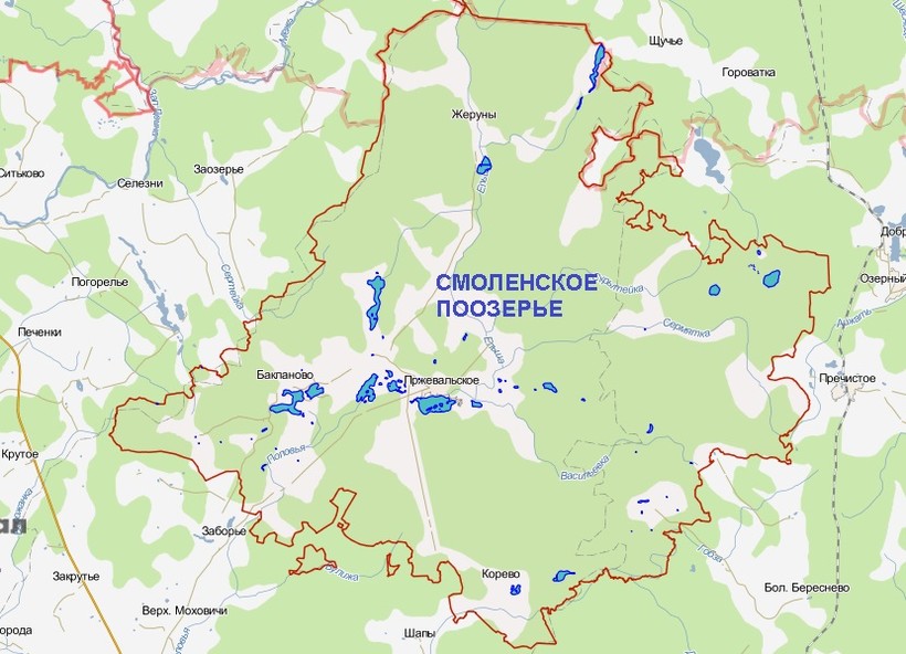 Национальный парк «Смоленское Поозерье» расположен в Демидовском и Духовщинском районах Смоленской области на огромной площади (почти 1 500 квадратных километров). Это территория лесов и озер, причем большую ее часть, 80 %, занимают густые леса.