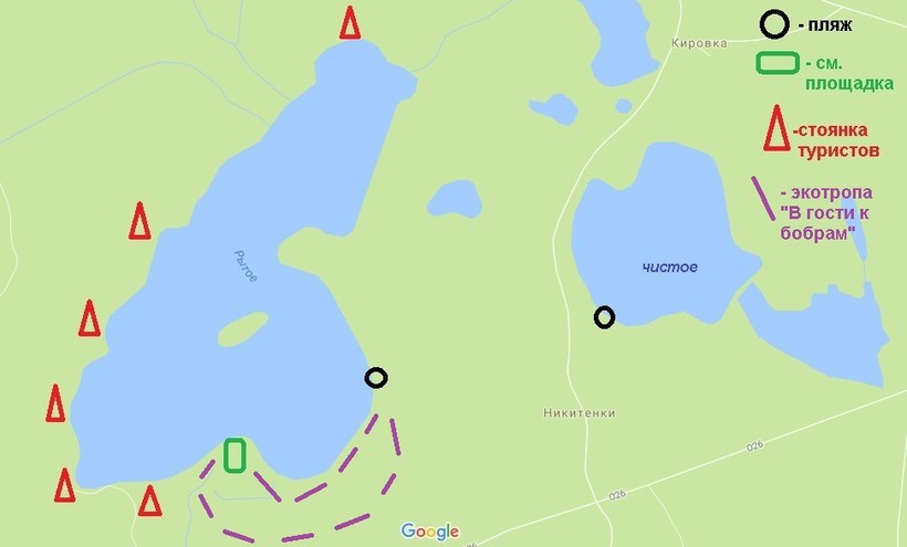 - базу «Чайка». Расположена в деревне Никитенки, между двумя озерами — Рытое и Чистик. На базе можно снять небольшой деревянный коттедж в районе 10 000 в сутки, а также двухместный номер с кухней и душем за 1 200 рублей.