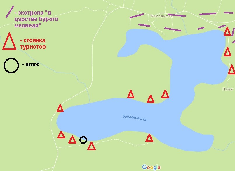 - Баклановское. Самое глубокое озеро в парке (максимальная глубина — 33 метра). Водоем очень большой, уступает лишь Сапшо, но на берегу есть только один пляж, зато много туристических стоянок, более 10. Я нанес их на карту. Лично мне не нравится здесь купаться, во-первых, на пляже постоянно много людей, а во-вторых, дно озера непредсказуемое, местами обрывистое, а я такое не люблю.