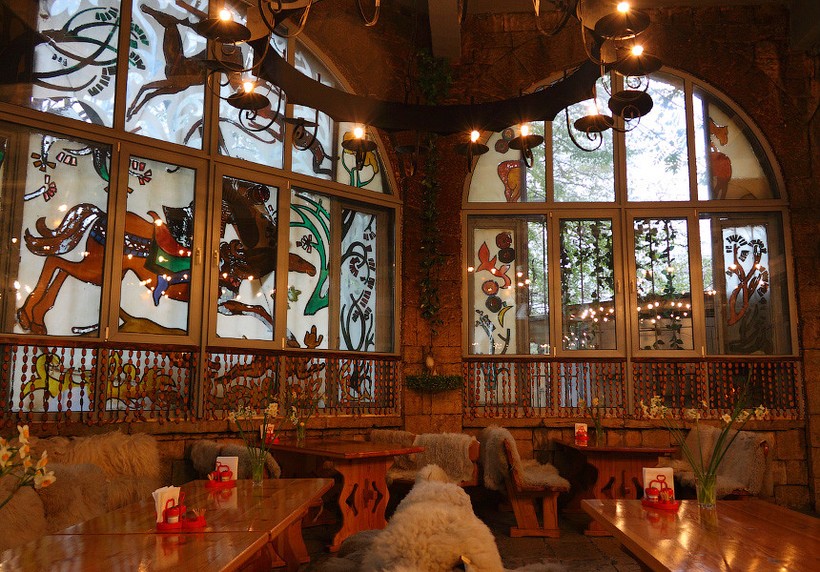 На первом этаже башни находится уютный ресторанчик. Внутри просторно, есть камин, стоят деревянные столы и скамейки. Попробовать там можно национальную кавказскую кухню. Я заказывала шашлык, соленья, фаршированные баклажаны, горячий хлеб, соусы к мясу. Перечислять все вкусности я не стану: лучше один раз попробовать, чем сто раз услышать. Особенно понравился травяной чай из самовара, стоящего прямо во дворе. Осталась довольна этим местечком и сказать больше — была приятно удивлена. Согреться после восхождения к облакам было не лишним.