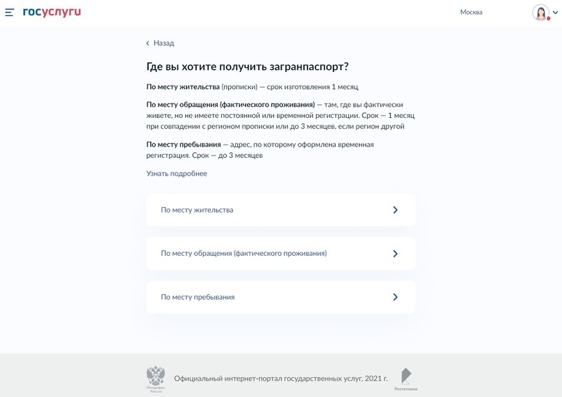 Способ, который поможет сократить время: можно указать на «Госуслугах», что забирать документ вы будете там, где прописаны. Тогда срок оформления составит всего 1 месяц. Минус этого варианта: вам придется поехать за результатом по месту прописки, а в случае с биометрическим паспортом — перед этим съездить туда же, чтобы сверить анкету с оригиналами и сделать дактилоскопию.