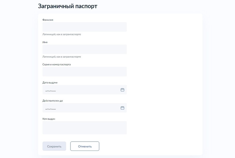 - В пустые поля внесите данные в том виде, в каком они записаны в заграничном паспорте.