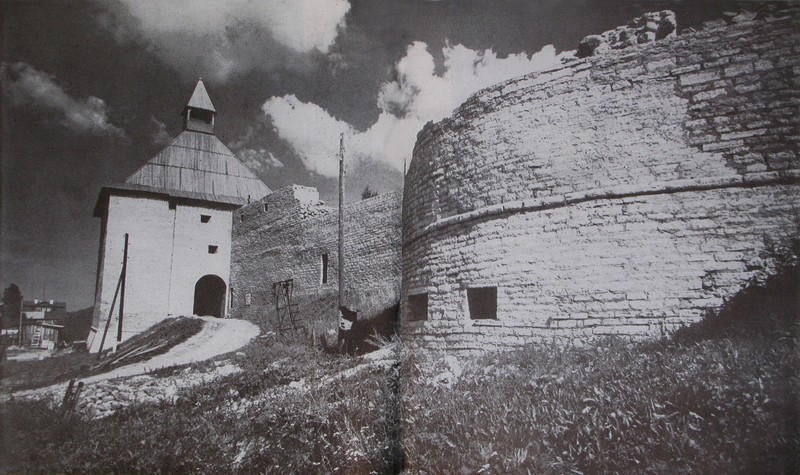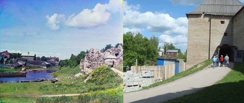 Много споров велось тогда и продолжает вестись сегодня насчёт правомерности подмены разрушенных исторических памятников «новоделом». Я склонна считать так: раз всё в этом мире рано или поздно подлежит разрушению, то для передачи потомкам хотя бы отголоска прошлого этот самый «новодел» вполне имеет место быть. Иначе ходить бы нам с вами, дорогие туристы-путешественники, сегодня вот по таким руинам, как на фото слева (Вратарная башня в начале XX века).