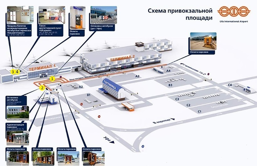 - На автобусе. Чуть менее удобный способ из-за частоты следования. Узнать расписание и приобрести билет можно заранее на сайте местного автобусного перевозчика «Башавтотранс», либо забронировать по телефону их «горячей линии» 8-(347) 297-97-92 (не менее чем за сутки до отправления). Если вы боитесь возможной задержки рейса, то можете воспользоваться услугами кассового пункта непосредственно в аэропорту (3). Также обратите внимание, что в аэропорту автобусные остановки до Уфы и для междугородних рейсов находятся в разных местах (1, 2). Дорога на автобусе занимает около 2 часов. Цена за билет колеблется от 190 руб. до 300 руб. Городской автовокзал Стерлитамака находится на ул. Худайбердина, 198.