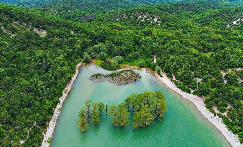 ИНТЕРЕСНЫЙ ФАКТ. Откуда на водохранилище появились кипарисы — точно не установлено. Есть версия, что посадили деревья здесь жители Калифорнии в память о своем погибшем сыне. По другой гипотезе, семена кипарисов были привезены в 30-е гг. XX в. из Мексики и посажены просто в лесной зоне, а после строительства запруды на реке место вокруг деревьев было затоплено.