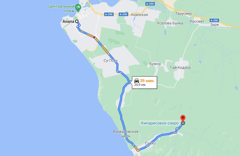 На Кипарисовое озеро-водохранилище из Анапы можно доехать на автомобиле за 30–40 минут (в летнее время может быть затруднен выезд из города из-за загруженности дороги).