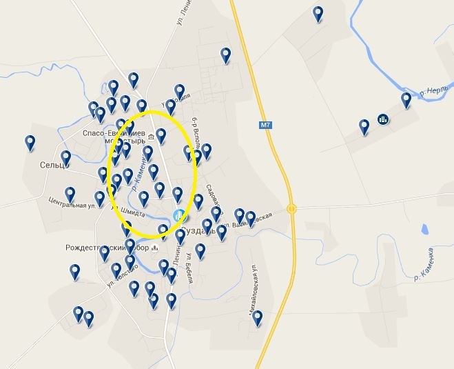 Самые известные места сосредоточены в центре города Суздаль. Достопримечательности на карте выделены желтым овалом. Это именно та часть города, которая изобилует как достопримечательностями, так и различными отелями и гостевыми домиками для туристов. Так как город этот небольшой, но при этом красивый, вы можете поселиться и в отдалении от центра, ближе к реке Нерль. Это еще и позволит отдохнуть от шума туристических улиц. К тому же, проживание здесь обойдется немного дешевле. Правда, при таком выборе до центра придется прогуляться пару километров.