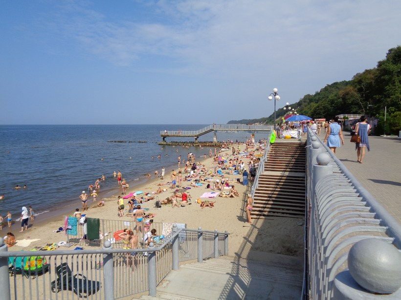 Светлогорск — приморский город. Поэтому жить лучше, конечно же, у моря. Правда, город расположен на высоком берегу (36 метров выше променада), а спуск к набережной и пляжу займет минут 10 пешком. Это как если бы вы спускались по лестнице с 12-го этажа!