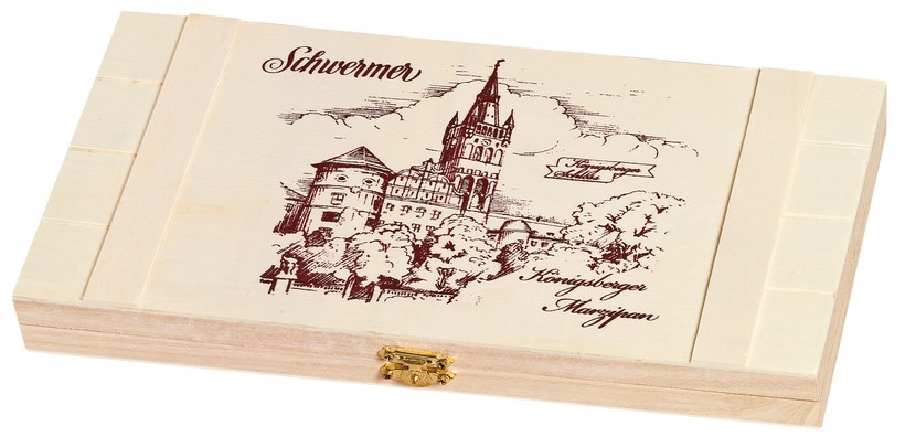 Хороший марципан — это дорогое лакомство. Две трети его массы составляет измельченный миндаль. Как ни странно, один из лучших сувениров из Калининградской области сегодня производится под маркой «Кенигсбергский сувенир» на фабрике «Швермер» в Бад Вёрисховене. Сюда производство переехало из Кенигсберга. Ассортимент фабрики разнообразен. Можно купить марципаны различных форм и размеров, как в обычной упаковке, чтобы полакомиться самим, так и в подарочных коробках из дерева.