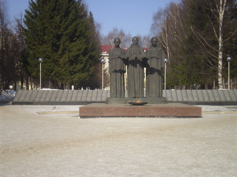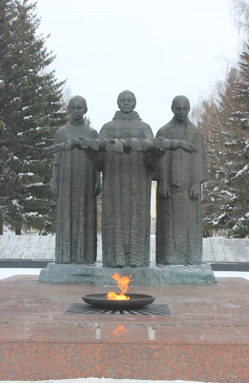 Или как называют местные — «Вечный огонь». Бронзовый мемориал представляет из себя скульптуры трёх женщин – матери, дочери и жены солдата. В центре горит неугасаемое пламя, а по бокам мемориала – плиты с именами погибших в Великой Отечественной войне. Как и во всех российских городах, 9 мая здесь происходит возложение венков и цветов. Адрес: улица Коммунистическая (напротив Пединститута).