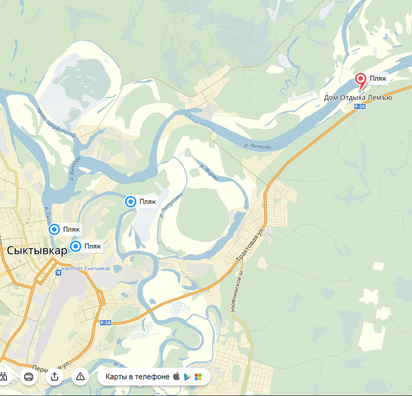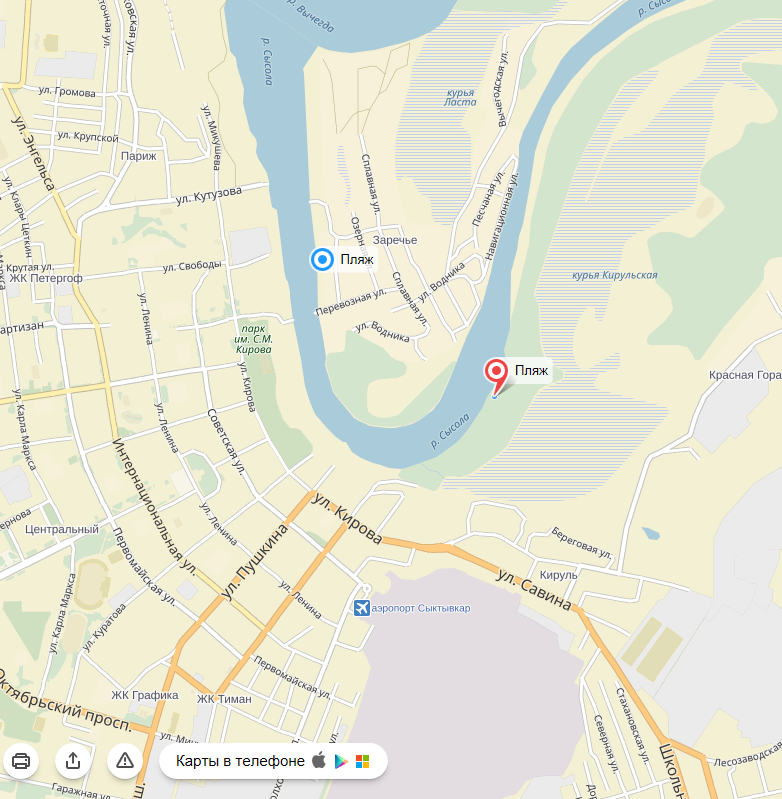 - Городской пляж. Самое популярное среди местных жителей, поэтому и очень многолюдное. Пляж песчаный. Находится в местечке Кируль недалеко от аэропорта Сыктывкара. Здесь можно искупаться в реке Сысола, но будьте внимательны — в центре реки есть яма 3,5 метра, а так дно ровное, очищенное. Пляж легальный, поэтому на берегу дежурят медики и спасатели. Вход бесплатный.