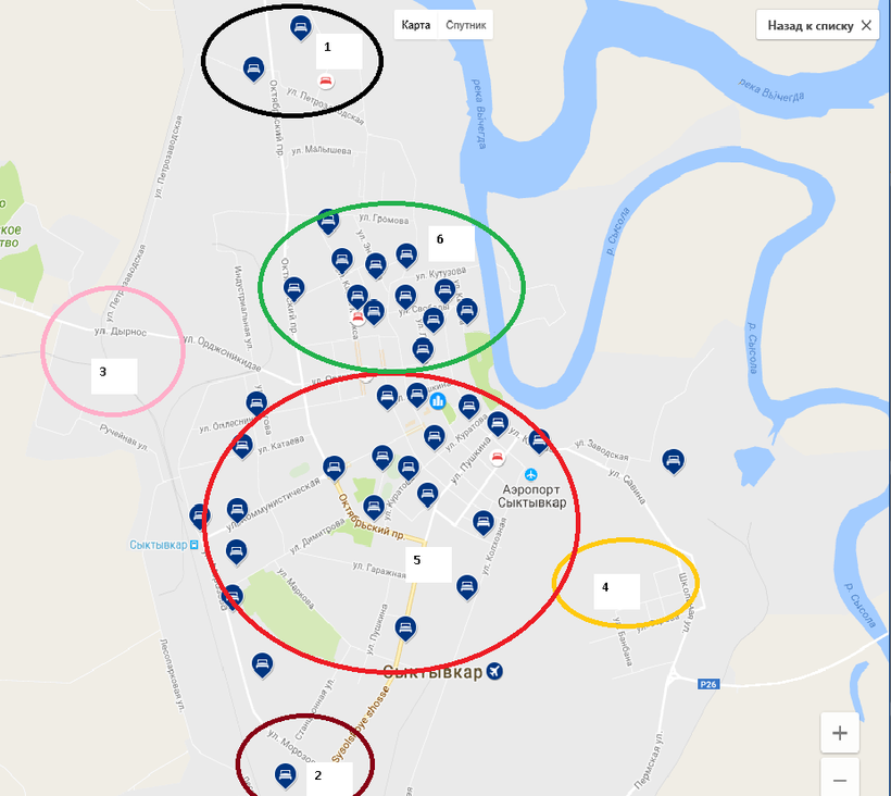Но к сожалению в районе нет отелей. К неофициальным (основным) можно отнести: район Орбита (1), Давпон (2), Дырнос (3), Лесозавод (4), Центральный (5), Октябрьский (6). См. карту отелей ниже. Бронировать жилье вы можете на букинге, а тут сравнить цены.