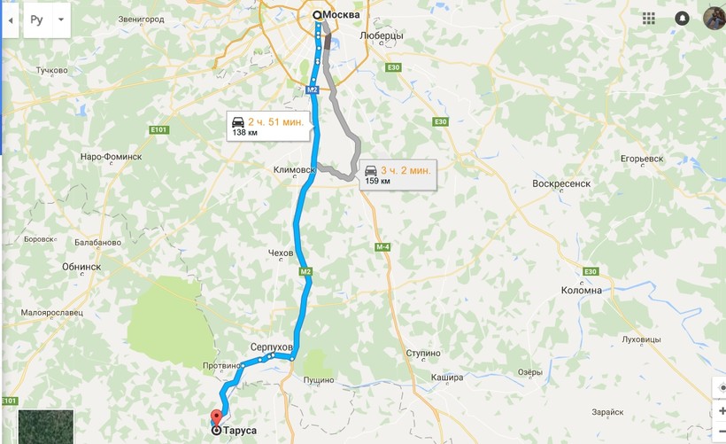 Москву и Тарусу разделяют всего 118 километров, поэтому многие жители столицы предпочитают добираться до калужского города на личном автомобиле. Их путь пролегает по федеральной трассе М–2, расходы на поездку, точнее, на бензин, составляют около 500 рублей. В дороге тратится около двух часов.