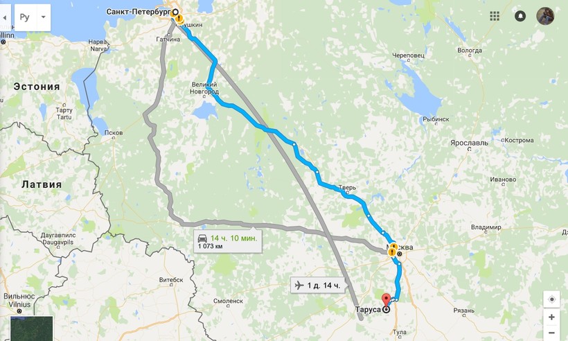 Между Тарусой и Санкт-Петербургом — 864 километра, которые, в среднем, можно проехать за 11–12 часов. До Москвы петербуржцы доезжают по федеральной трассе М–10, а оттуда — по уже упомянутой М–2. На такую поездку на легковом автомобиле тратится порядка двух тысяч рублей.