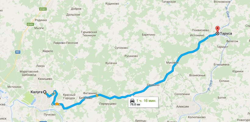 Расстояние между Тарусой и Калугой по прямой — 63 километра, автомобилям приходится преодолевать 73 километра. Время в пути на своей машине составляет час с небольшим, на бензин будет потрачено около 200 рублей. Железнодорожных переездов на дороге я не помню, поэтому особых задержек в пути быть не должно.