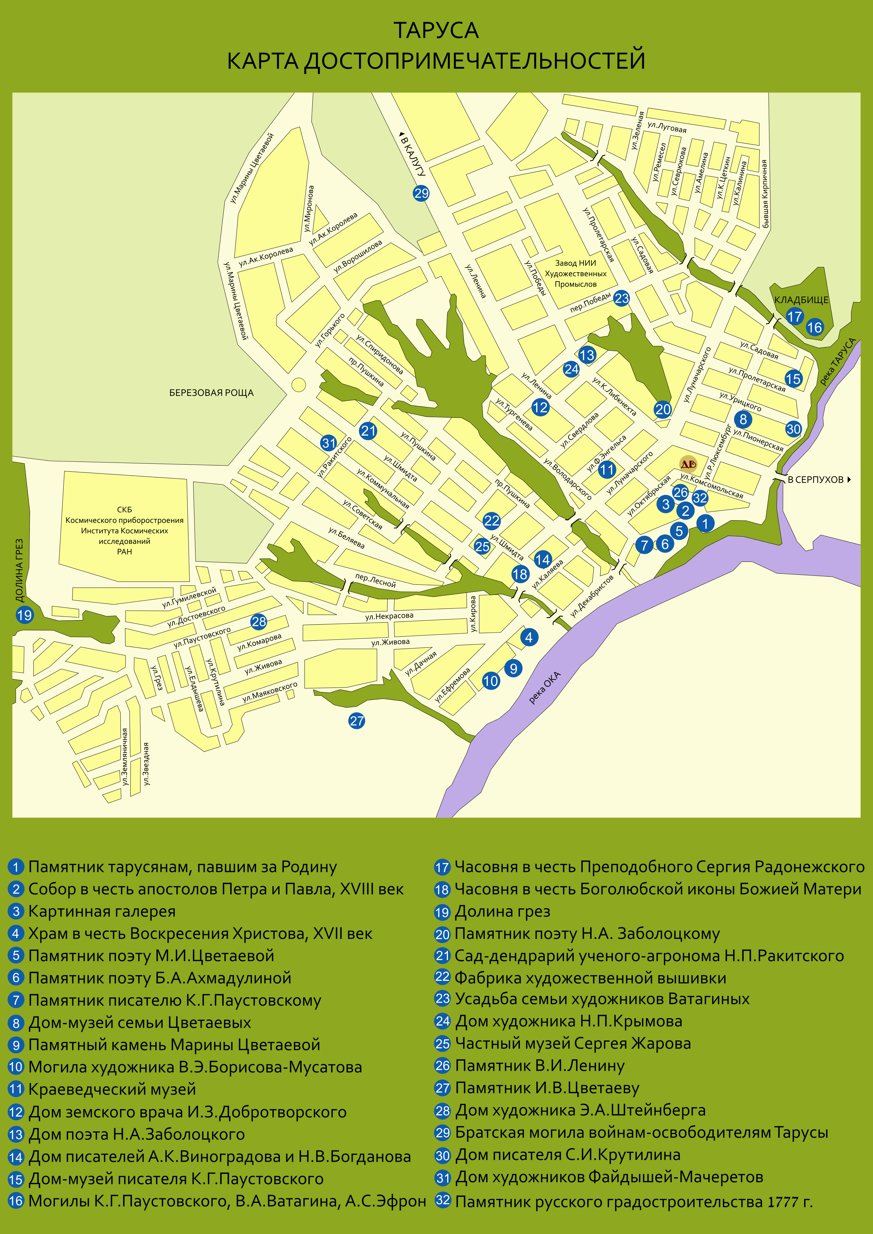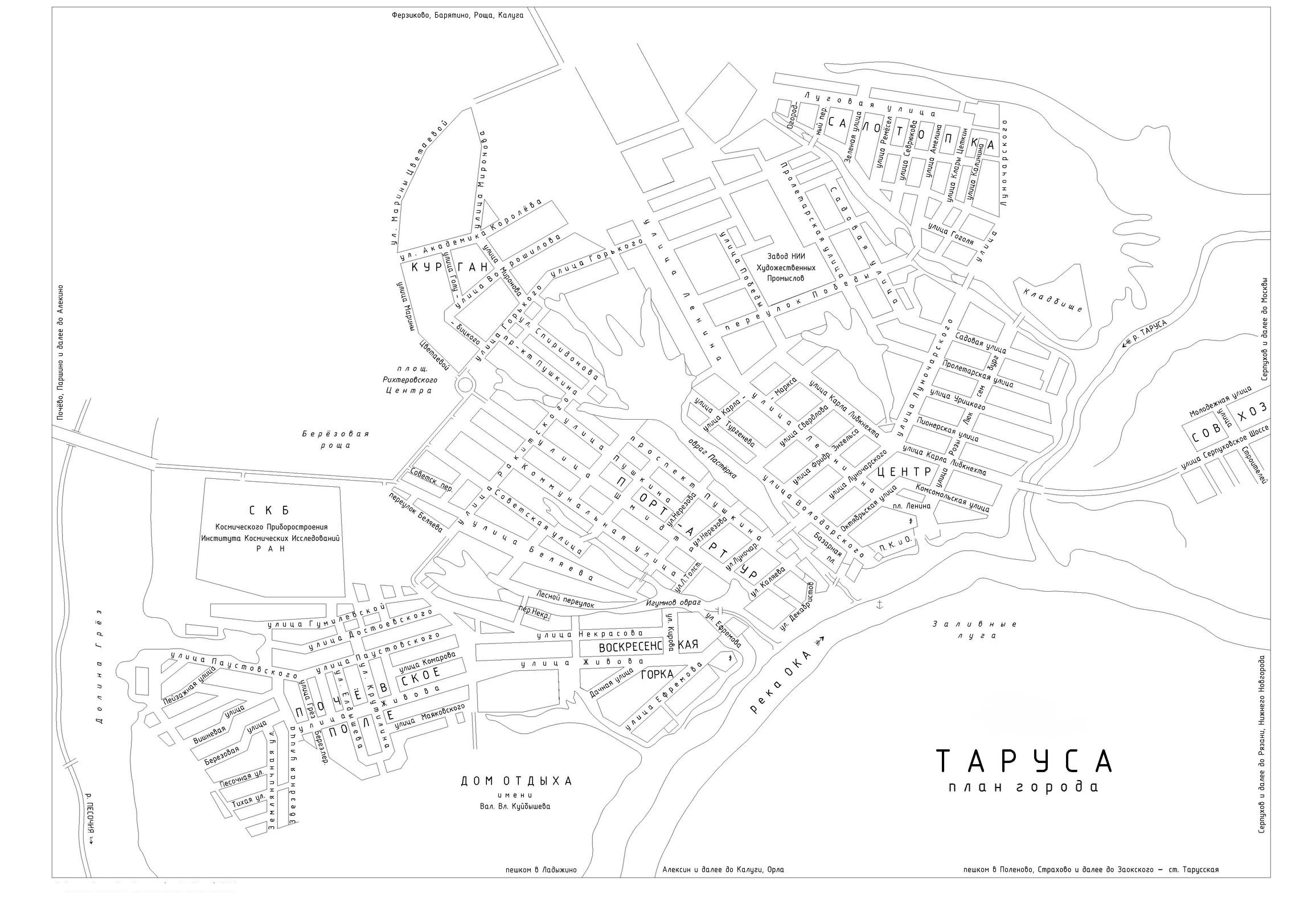 В списке популярных карт можно посмотреть карту Тарусы на русском с достопримечательностями. Для скачивания карт достаточно щелкнуть мышкой по изображению.