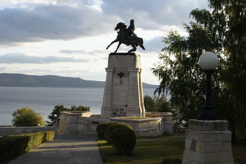 Скульптура установлена в очень живописном месте на берегу Куйбышевского водохранилища. Конный памятник основателю города был открыт в 1998 году. А еще немного позднее у ее подножия было высажено несколько десятков вишневых деревьев.
