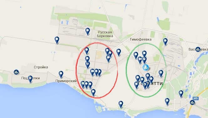 В городе Тольятти районы подразделяются следующим образом: Автозаводский, Комсомольский и Центральный районы. Наиболее удачным для проживания является Центральный. Это связано и с тем, что здесь сосредоточено больше всего достопримечательностей, и с относительной удаленностью от промышленных предприятий. Этот район еще называют Старым городом. Именно здесь сосредоточено наибольшее количество отелей. Все эти заведения находятся в одном и том же Центральном районе. Разница заключается только в том, что поблизости с зоной, выделенной зеленым цветом, расположено чуть больше памятников и прочих примечательных мест. Зато со стороны красной зоны находится, наверное, главная тольяттинская достопримечательность — Технический музей АвтоВАЗа. И еще — очень живописный микрорайон Приморский. Цены на гостиничные номера в обеих выделенных зонах примерно одинаковые — можно найти отель и за 1500 рублей в сутки, и за 2500 и за 3000 рублей.