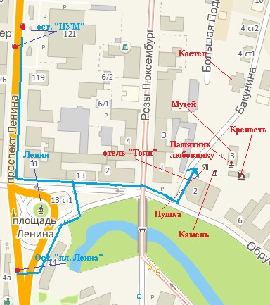 - На общественном транспорте и пешком. Вам нужно доехать до остановок «ЦУМ» или «Площадь Ленина», через которые проходит практически весь общественный транспорт. Время в пути составит от 15 до 35 минут, все зависит от того, из какого района вы едете. Стоимость проезда на автобусе составляет 17 рублей, на троллейбусе и трамвае – 15 рублей. На транспорте есть табличка с кратким описанием маршрута, и эти остановки обязательно указаны. Если сомневаетесь, в какую сторону ехать, то спросите прохожих: томичи, привыкшие к гостям в городе, очень отзывчивы и подскажут верную дорогу. Далее вам нужно дойти до памятника В.И. Ленину, пройти его и добраться до улицы Бакунина. Лучший ориентир – отель «Тоян», который находится у начала улицы. Ну а тут 5 минут вверх – и вы у цели. Сначала увидите Костел, а через дорогу от него лестница в гору. Это и есть территория музея.
