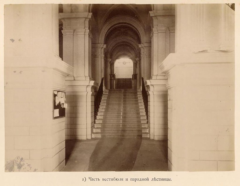 В подвальных помещениях были кладовые, служебные комнаты, закусочная и шинельная для учащихся.