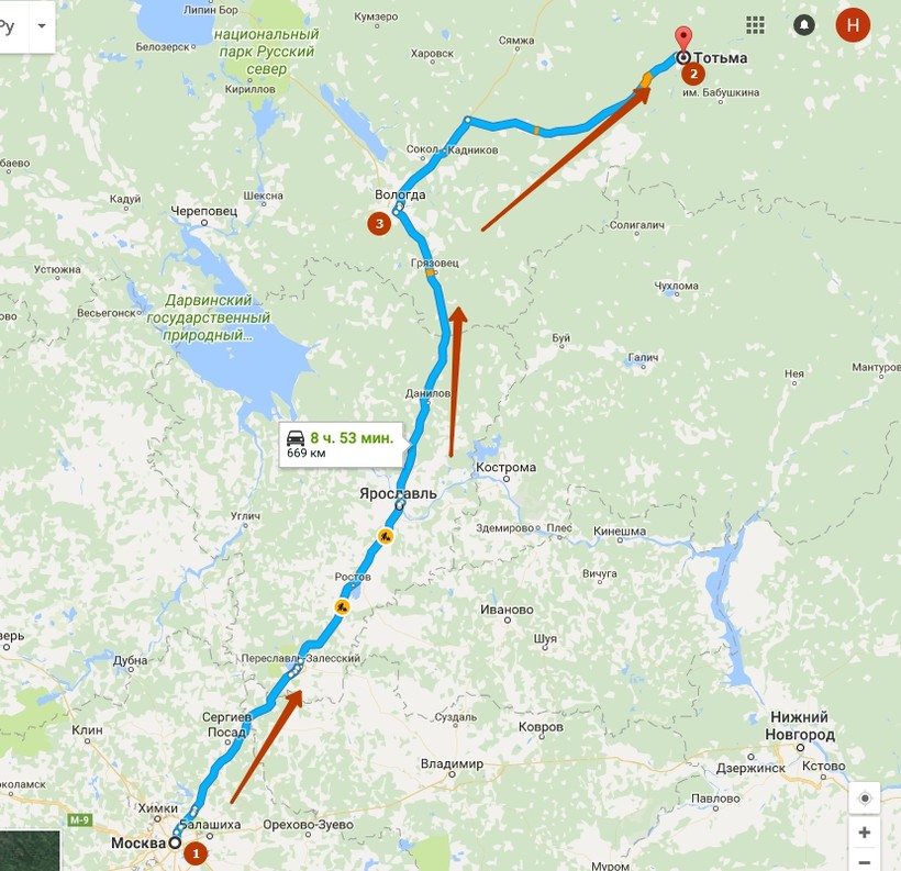 Вы пуститесь в путь по Р7 в сторону а/д Холмогоры и по М-8 двигайтесь к Ярославскому шоссе. В этом случае от Тотьмы вас будет отделять порядка 700 км, на преодоление коих уйдет не менее 9 часов.