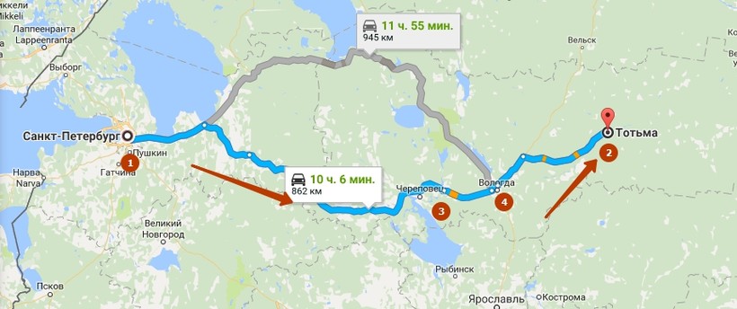 Мы едем из Питера (1) по Мурманской трассе и потом поворачиваем на А 114. Далее мимо Череповца (2) и Вологды(3) двигаемся к Тотьме 4). Расстояние, которое вам придется одолеть: около 900 км.