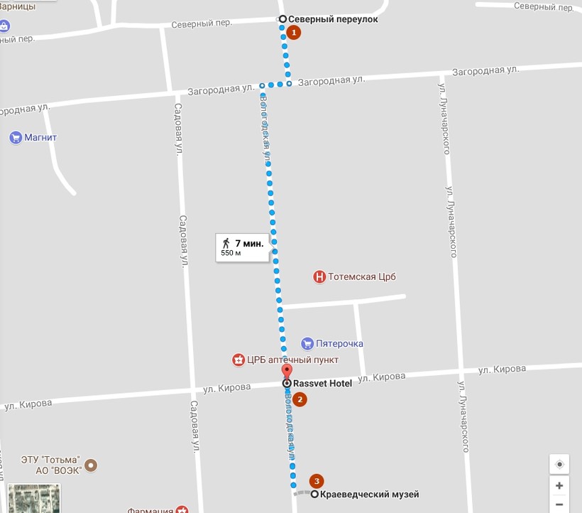 - Гостиница «Картуши» (1) в центре Тотьмы на ул. Советской, 26. Тут двухместный номер с общей ванной вам обойдется от 1200 рублей. В случай удобств в номере готовьте 2200 руб..