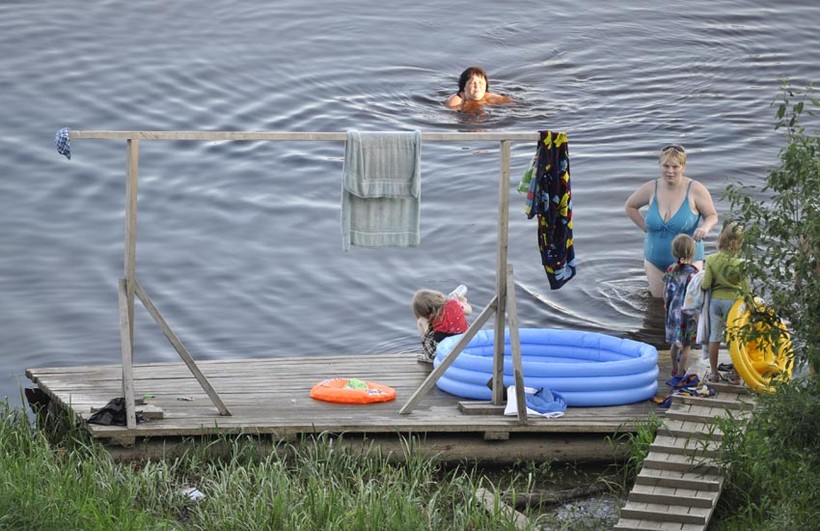 Тотьма не очень-то подходит для пляжного отдыха. Кроме того, периодически СЭС объявляет, что купаться в Сухони из-за загрязнения вообще нельзя. Но местное население в жаркую погоду на это внимание не обращает, а просто ныряет-плавает вот с таких мостков, которые периодически можно встретить у берега.