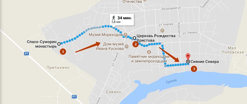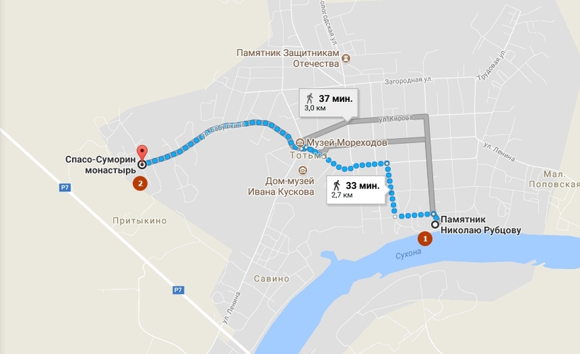 14.40 — Предлагаю теперь пройти до памятника Н. Рубцову (1), полюбоваться речными пейзажами.Потом продолжить знакомство с Тотьмой уже в направлении Спасо-Сумрорина монастыря (2), где мы посетим экспозицию музея Открытого хранения фондов.